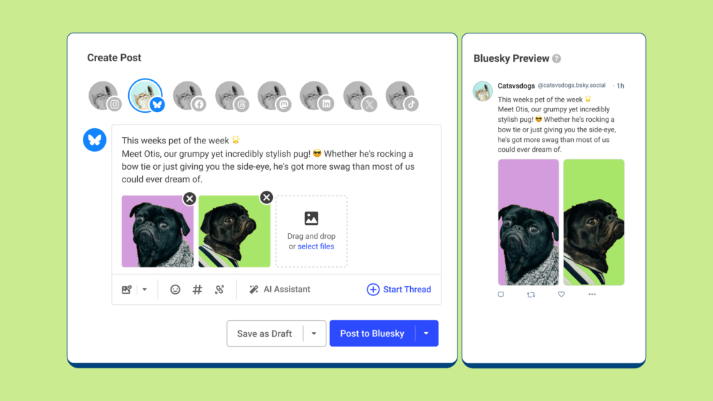 20-image carousels for ThreadsLinkedIn first-comment schedulingAuto-publishing for Facebook StoriesNotification publishing for Instagram, YouTube, and TikTokDrag and drop images to reorder themSchedule longer tweets (for X Premium users)Create and schedule AI images with Apple IntelligenceSchedule threaded posts on MastodonSchedule TikTok images
